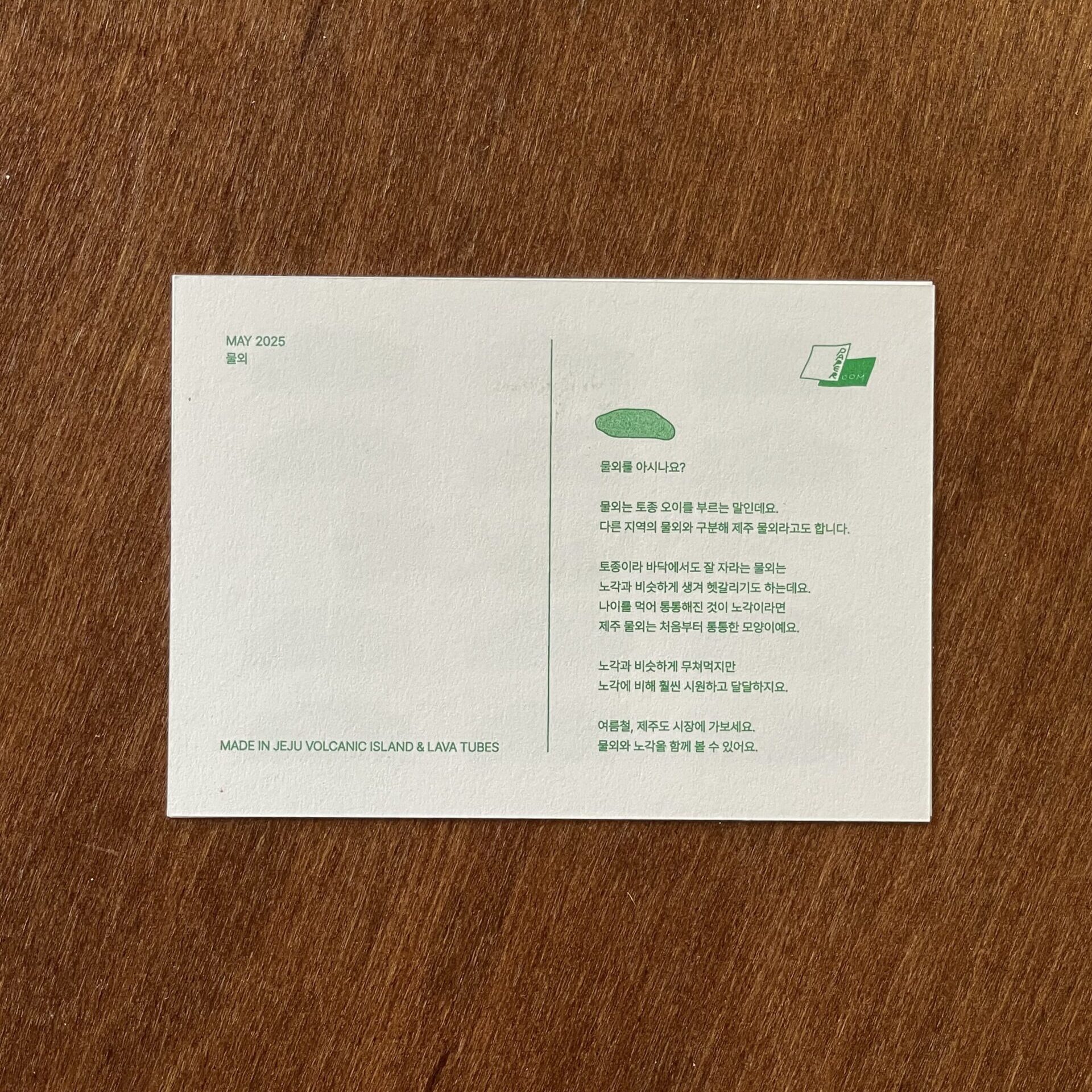 제주도 페이퍼룸에서 발행하는 월간엽서 2025년 7월호입니다. 페이퍼룸은 제주 유일의 리소 인쇄소로 매월마다 지역의 삶을 담은 엽서를 발행하고 있습니다.